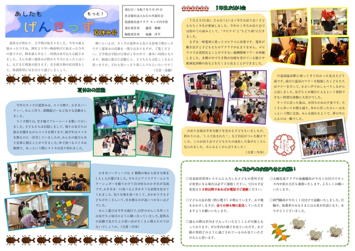 順次登所、宿題、自由遊び | 15:00 | おやつ、片付け |